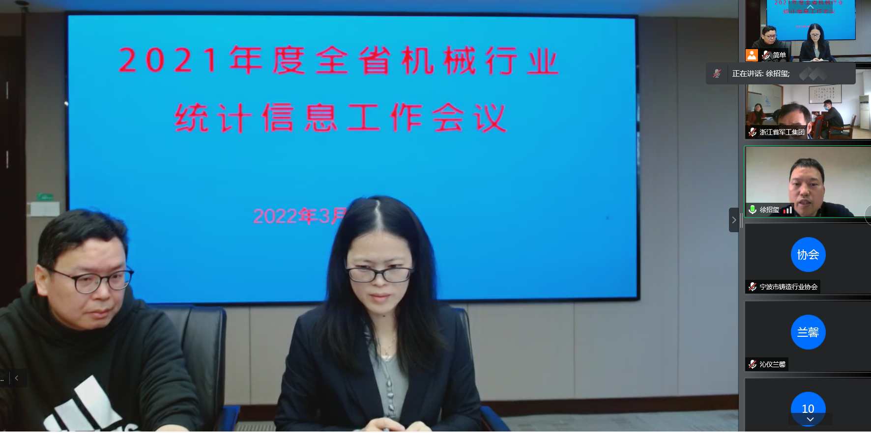 2022年3月25日,浙江省机械工业联合会主办的2021 年度全省机械行业统计信息工作会议(线上)召开,会议由省机械工业联合会副秘书长黄建芳主持,我协会参加了本次会议。