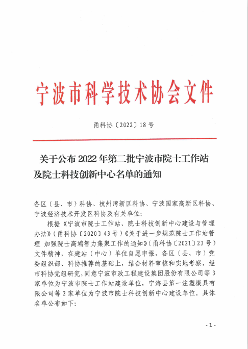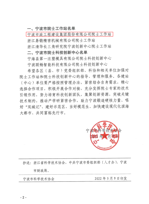5月9日,宁波市科学技术协会公布了2022年第二批市级院士工作站及院士科技创新中心名单,全市新增3家院士工作站、2家院士科技创新中心,海曙区宁波市政工程建设集团股份有限公司成功入选。