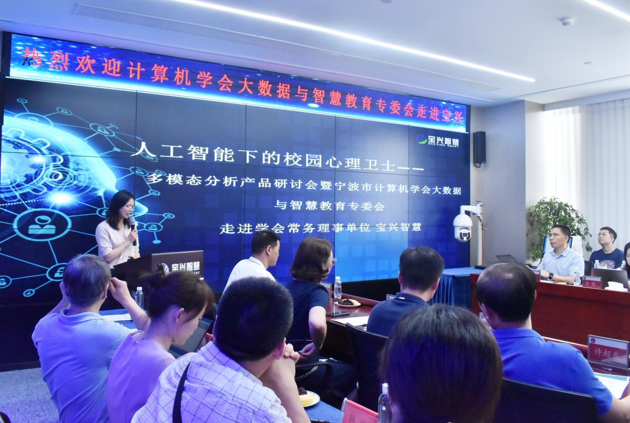 座谈会报告环节,宝兴工程师秦丽以PPT的方式详细展示了宝兴的智慧心理整体解决方案,通过分析学生心理健康案例,展示了多模态情绪分析技术原理,并介绍了学生异常情绪跟踪预警系统、心理测评智能辅助系统和心理健康档案管理平台的产品优势和技术亮点,以及基于AI智能的方案价值。