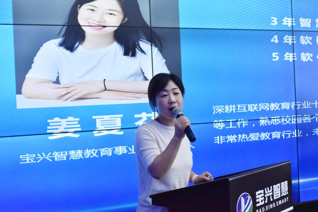 接着,宝兴教育线负责人姜夏芬针对智慧教育做简要介绍。讲述了自己在互联网教育行业中十二年丰富的从业经历,并介绍了宝兴智慧教育事业部组织框架和宝兴智慧教育服务体系。