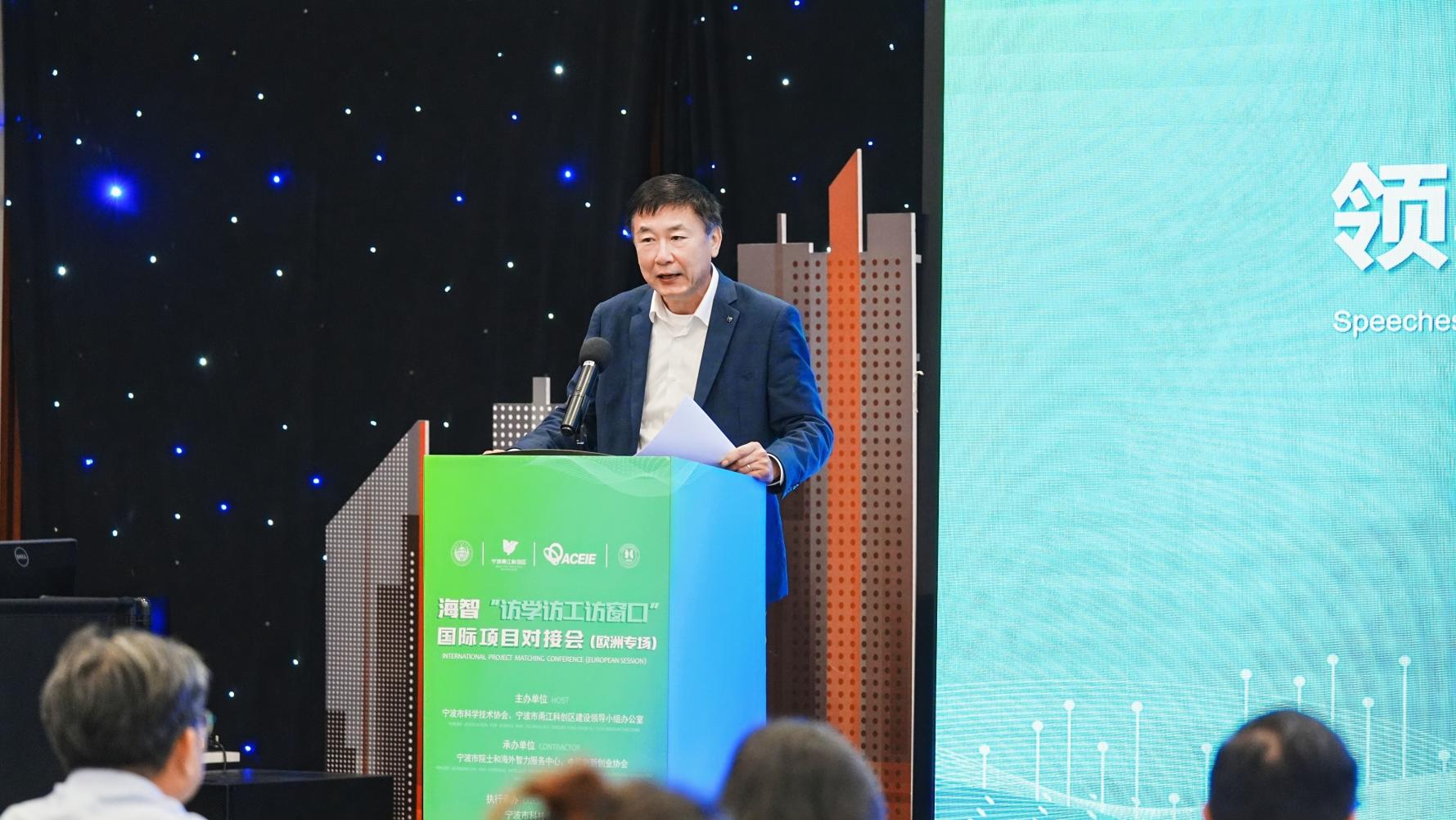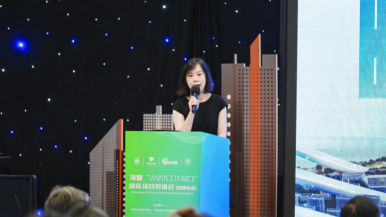 市科协党组书记方巍、 中欧创新创业协会宋志伟会长先后上台致辞。 宁波市甬江科创办发展合作部王逸芬部长就甬江科创区的建设情况空创新政策进行详细推介。