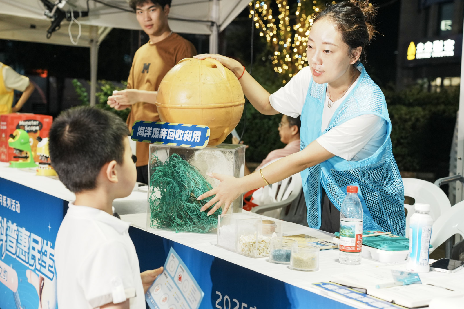 “海洋伙伴”环保点位同样引人深思。展台上陈列着由海洋废弃塑料再生制成的崭新产品,从笔记本到电动牙刷,直观地展示了“变废为宝”的全过程。孩子们抚摸着这些充满质感的再生材料,难以置信地问:“老师,这真的是用海里的瓶子做的吗?好酷!”一位家长在现场感慨道:“这个展示太有意义了,不仅让孩子懂得了环保,也让我们看到了循环经济的巨大潜力。”