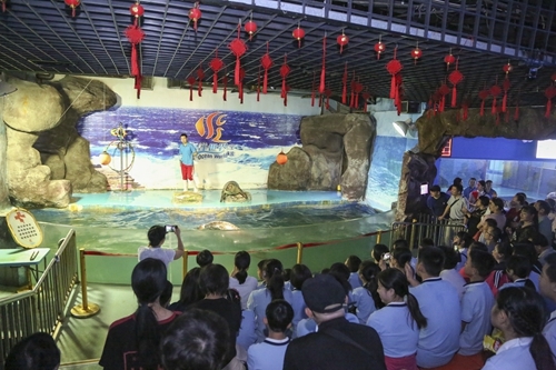 走进海洋世界,淡淡的海水腥味扑鼻而来。各种丰富多样的海洋鱼类、憨态可掬的大海龟,千姿百态的珊瑚礁、水母、海星、贝壳,来自极地的北极狐,以及许许多多形态各异、色彩艳丽的海洋生物都已经装进了同学们的心里。漫步于“海底隧道”中,宛如置身于神奇的海底,尽览迷人的水下世界。可爱的海狮珍妮公主和迷人的美人鱼带来的精彩表演,更是让大家兴奋不已。