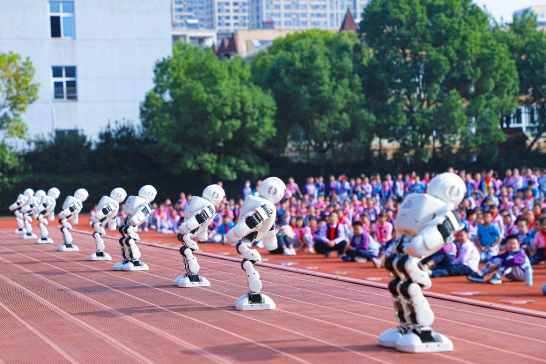 学校每年的科技节开幕式都相当新奇,有宇航员走秀、有巨型风筝飞上天等表演,而今年走的是激情热舞路线!只见十余个机器人一字排开,在舞台上做起了广播体操,听到熟悉的音乐孩子们也跟着做起了广播操。