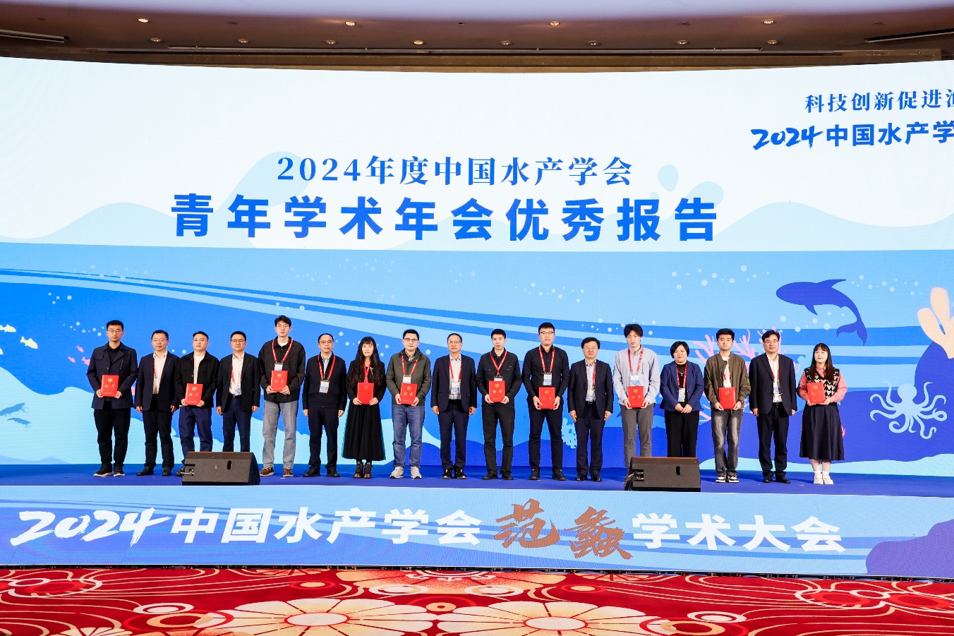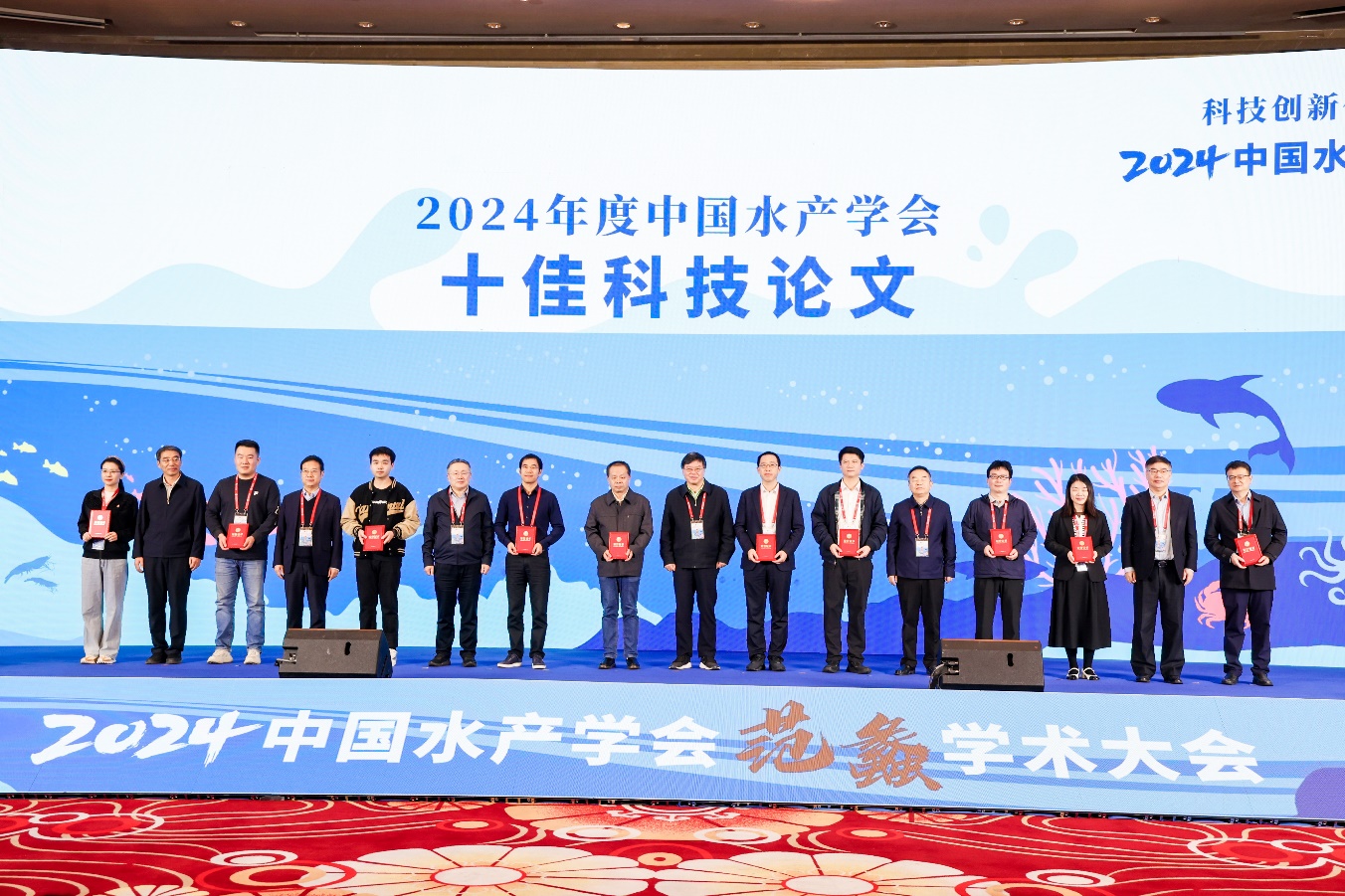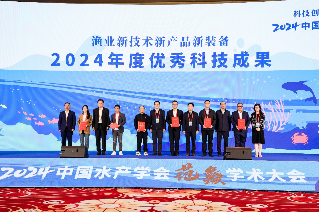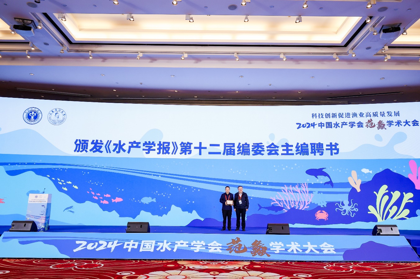 会上公布了具有前沿性、引领性、创新性、战略性的12个2024年渔业重大科技问题难题,15项渔业新技术新产品新装备2024年度优秀科技成果,评选出10篇2024年度中国水产学会优秀科技论文、10篇青年学术年会优秀报告,并向《水产学报》第十二届编委会主任委员、主编刘少军颁发聘书。