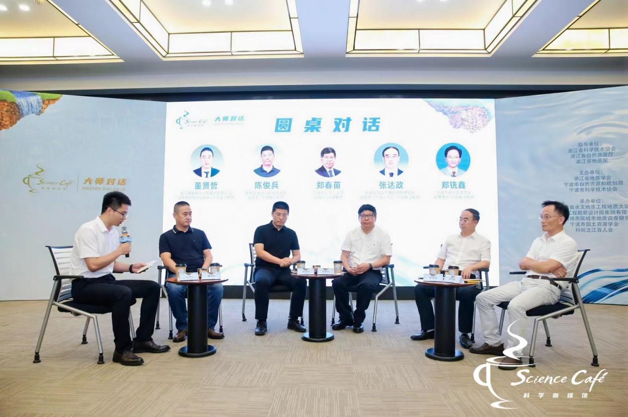 现场交流意犹未尽,在圆桌对话与互动交流环节中,浙江省地质院城市地质调查研究所副所长张达政和宁波市国土资源学会副理事长郑铣鑫同郑春苗、陈俊兵、董贤哲共同畅谈地质领域科学发现与技术创新。