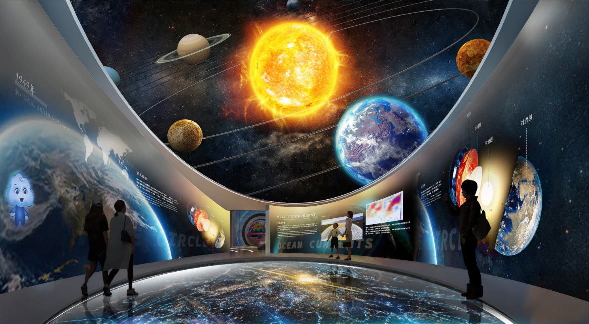 走进序厅,8米层高的半球形天幕剧场瞬间吸引了大家的目光。动态星轨投影在头顶缓缓展开仿佛让人置身浩瀚宇宙,这里不仅能实时呈现大气变化,还能展示奇特的天气现象,比如极光、流星雨等。在“蓝色星球”展区,裸眼3D技术动态演示了地球40多亿年的演变历程,双面投影的三圈环流模型生动解析了全球大气运动的奥秘。“求索之路”互动展区更是趣味十足,蝴蝶效应、厄尔尼诺、拉尼娜等气象知识通过互动游戏变得通俗易懂。