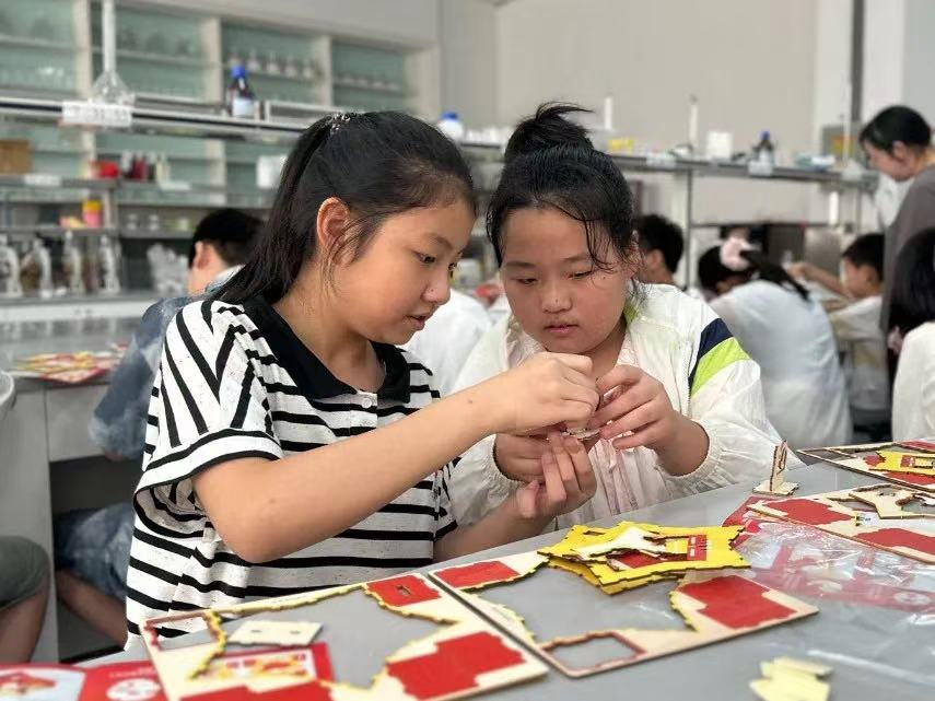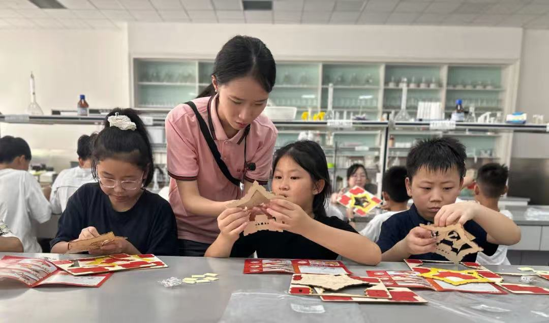 最后,孩子们来到材料工厂,在慈溪科协工作人员和志愿者的指导下,动手参与“星星向党”手工制作活动。这堂别开生面的手工课,巧妙地将动手实践、科学思维培养与红色基因传承相融合,让“爱党爱国”的情怀有了具象而温暖的表达。