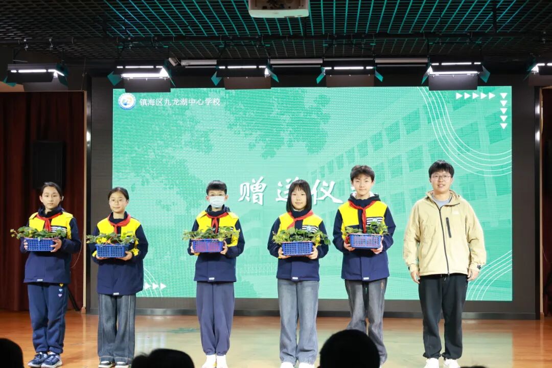 活动中,镇海区科协与镇海区教育局相关代表共同为“农科校园建设基地学校”揭牌。随后的“绿意启航”环节,科学副校长向学生代表赠送滴灌系统、盆栽草莓,孩子们郑重接过这份“绿色礼物”,也承担起观察生命、探索自然的责任。