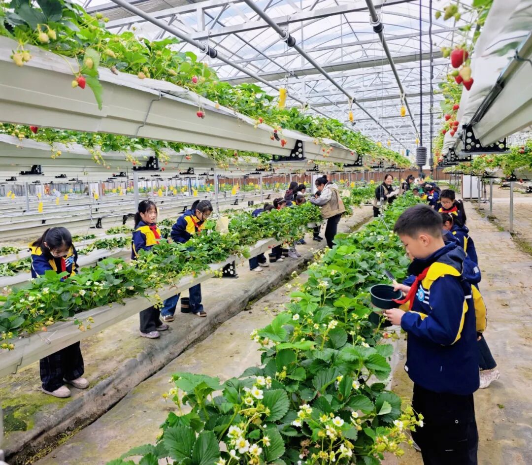 在特色种养基地,同学们实地探访“稻虾共生”“稻鸭共生”生态循环模式,深入了解现代生态农业如何利用生物互作原理实现绿色高效种养,将书本知识与前沿农业科技紧密结合。萌宠互动区内,大家近距离观察小动物生活习性,在轻松互动中感受生物多样性的乐趣。最受期待的“空中草莓”种植园里,无土栽培、水肥一体化智能灌溉系统令同学们大开眼界——悬空模式精准控温控湿、大幅减少病虫害,智能传感实现水肥精准供给,让草莓品质更优、产量更高。同学们还亲手挖掘草莓苗、移栽入盆,在实践中真切感受现代农业科技的精妙。本次研学将科技元素贯穿始终,让同学们在沉浸式体验中解锁农业科技奥秘,真正实现了在游中学、在学中乐。